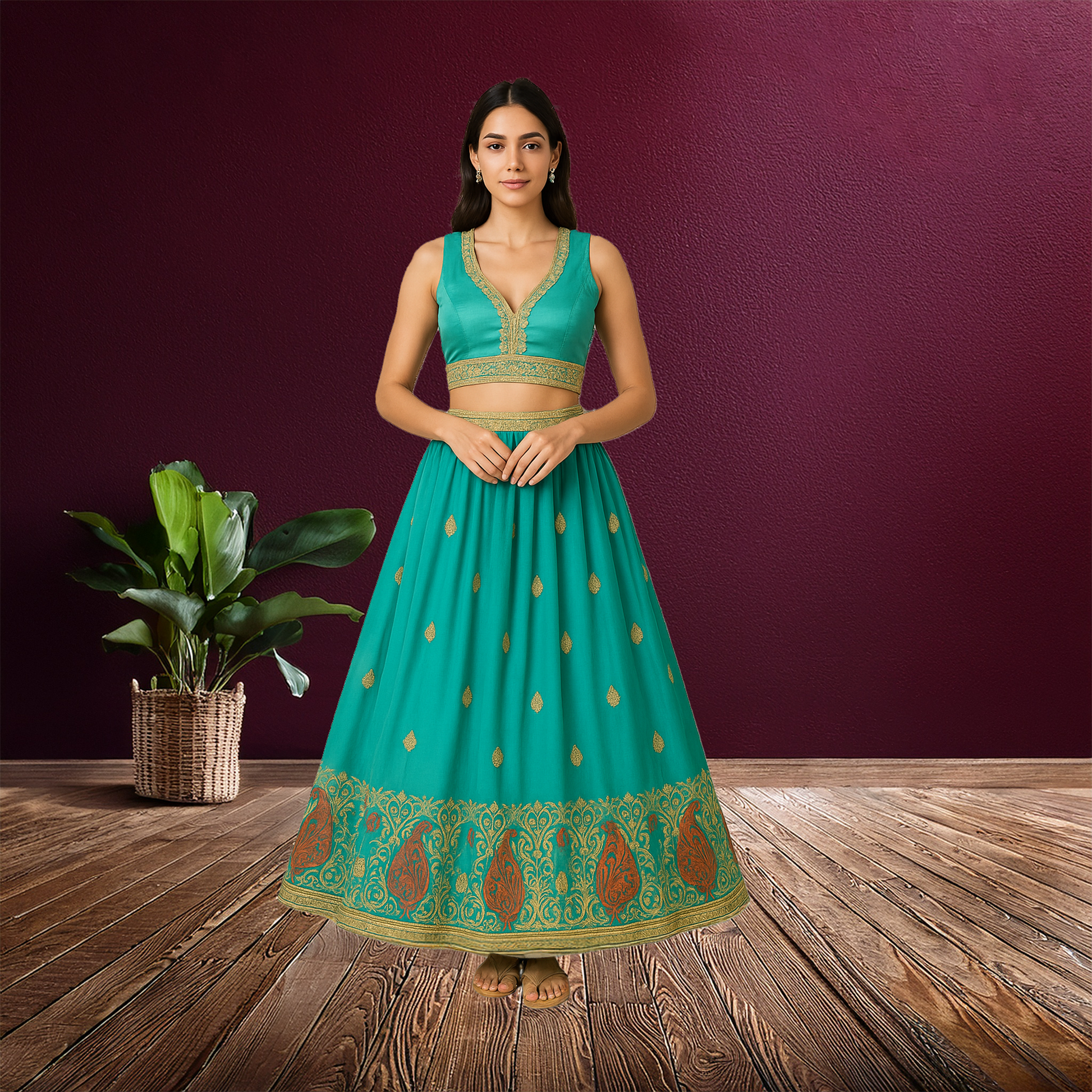 - Lehenga Skirt: Full-circle skirt with beautiful paisley motifs and golden border detailing