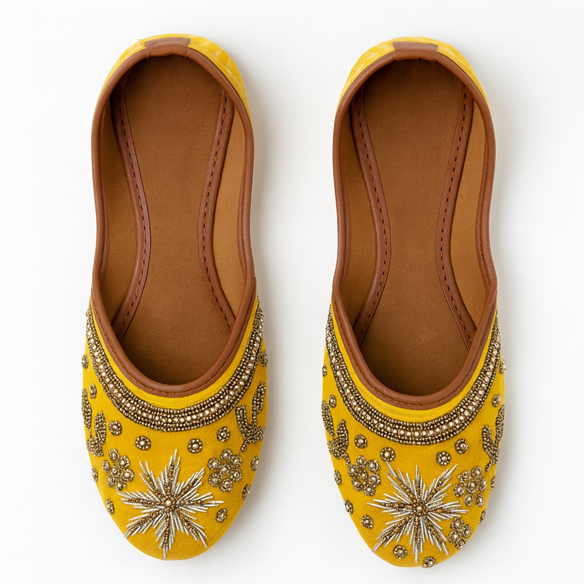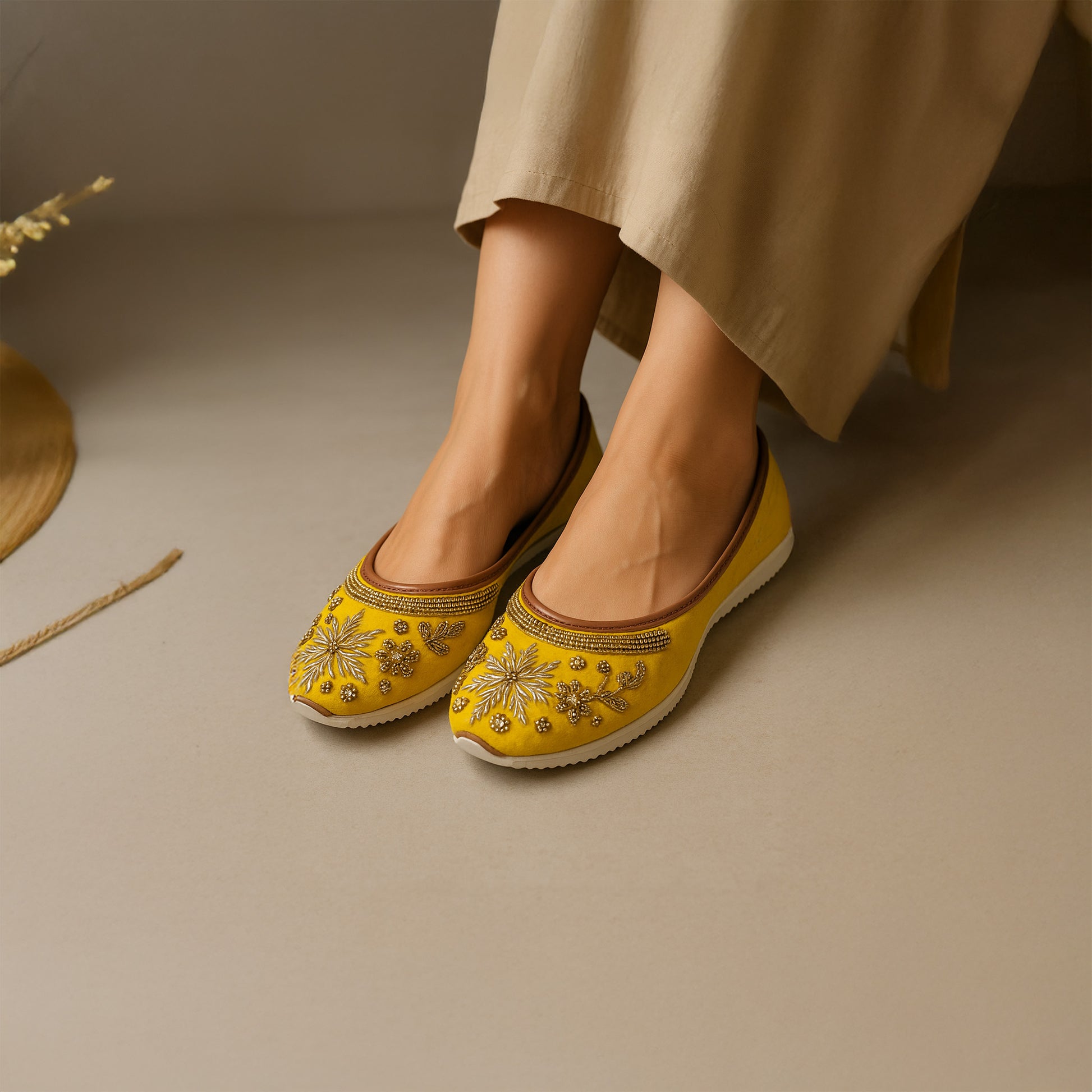 Handcrafted Yellow Juttis with Floral Moti Embiodery