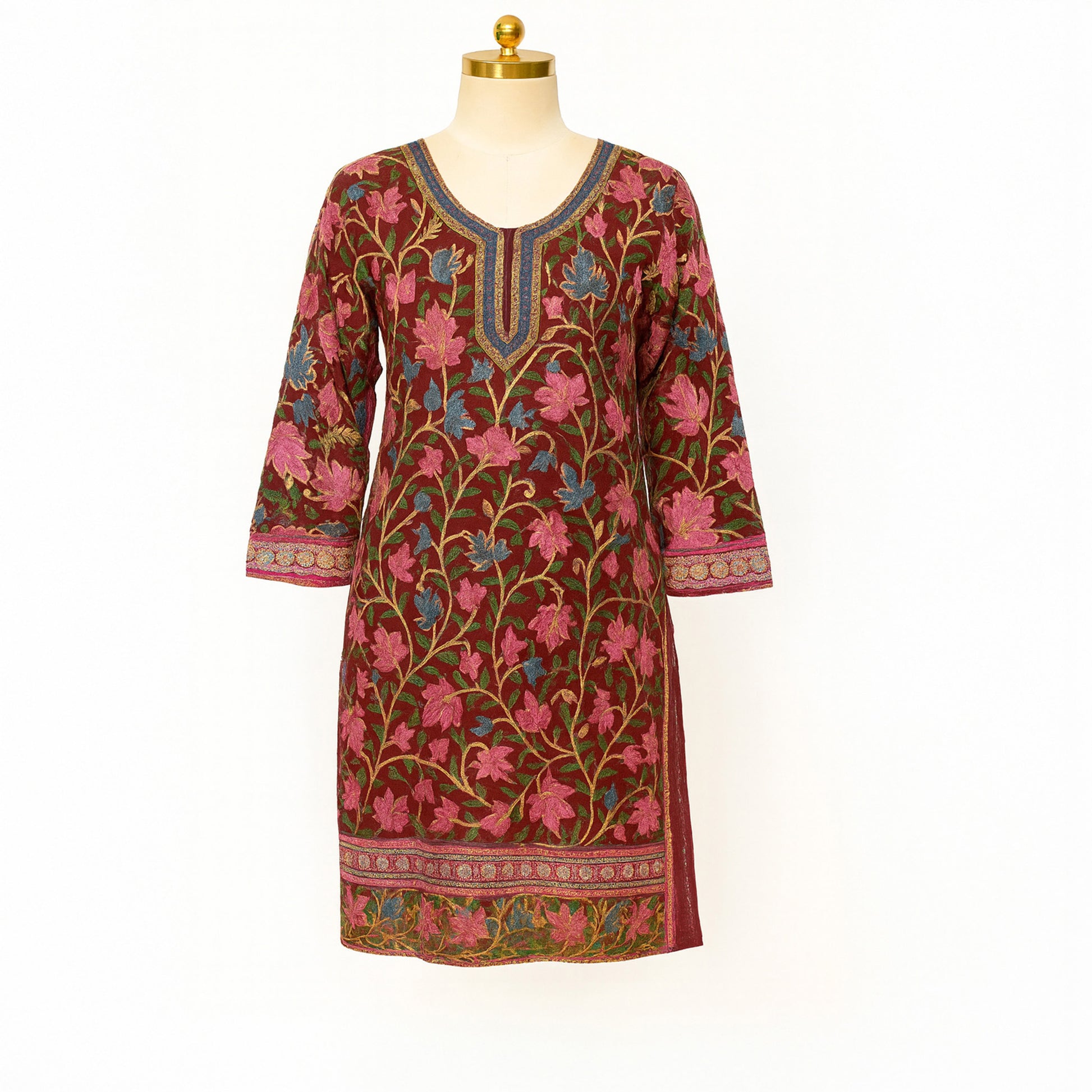 Elevate your ethnic wardrobe with this exquisite heavy embroidered kurti featuring intricate floral motifs in rich pink, blue, and green hues. The luxurious embroidery work covers the entire garment, creating a stunning visual appeal that's perfect for festive occasions and special celebrations.