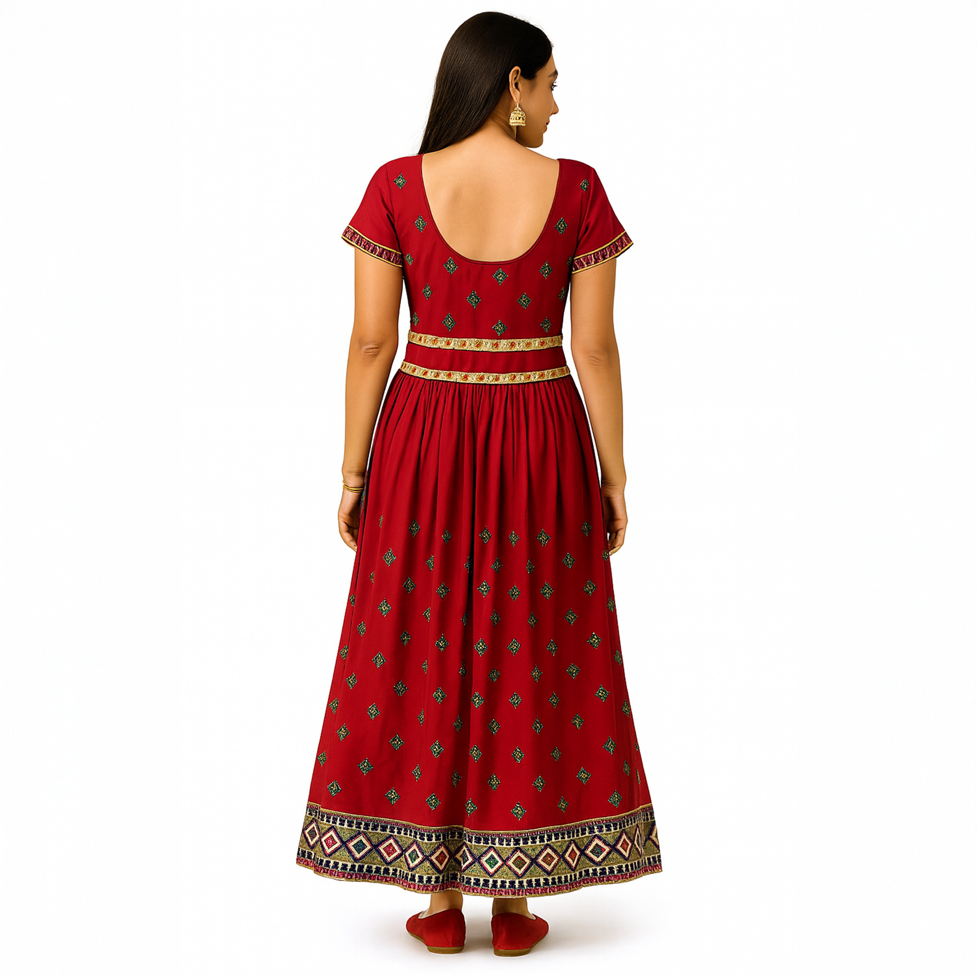 - Intricate Embroidery: Golden zari work with traditional diamond and geometric patterns on borders and hemline