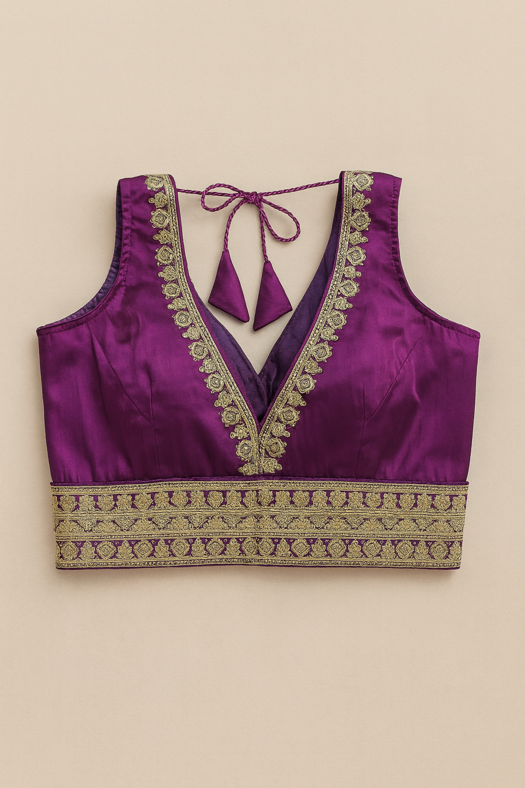 - Blouse: Deep purple velvet choli with elegant V-neck and golden embellished trim. The blouse has sleeves attached and is extensible from 34-42
