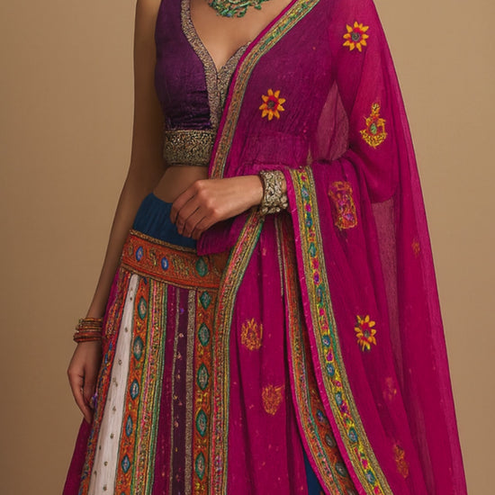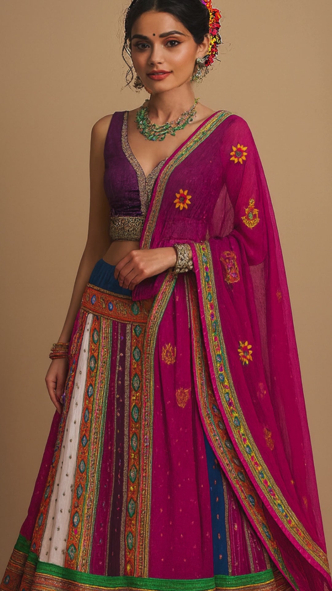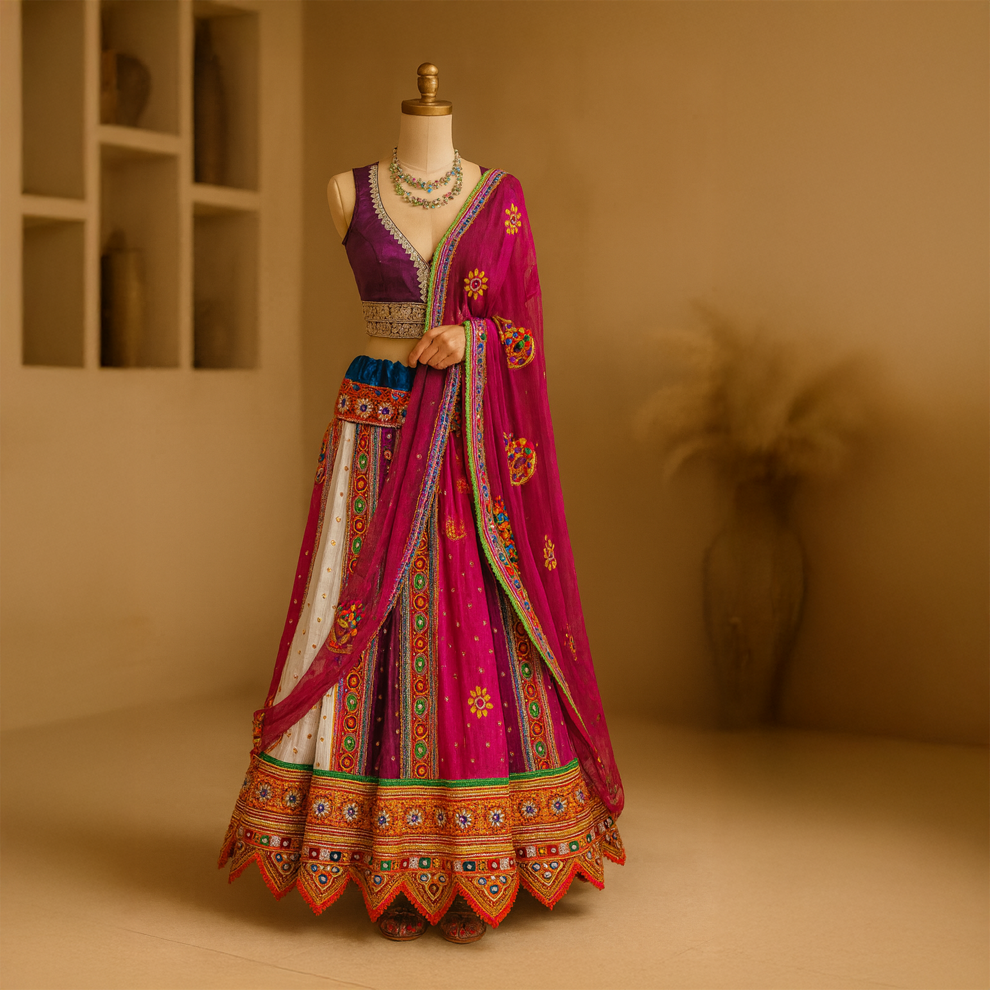 - Vibrant Multicolor Skirt: Beautifully embroidered lehenga with intricate mirror work and traditional motifs in rich colors including navy blue, pink, orange, and cream